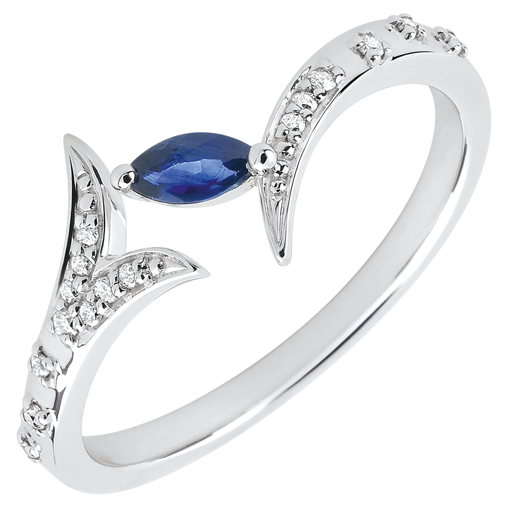 O ramură strălucitoare îngheţată în etern. Frunza sa preţioasă, safir tăiat marquise, este subliniată de aurul alb încrustat cu briliante ce îi serveşte drept sipet.