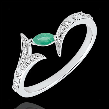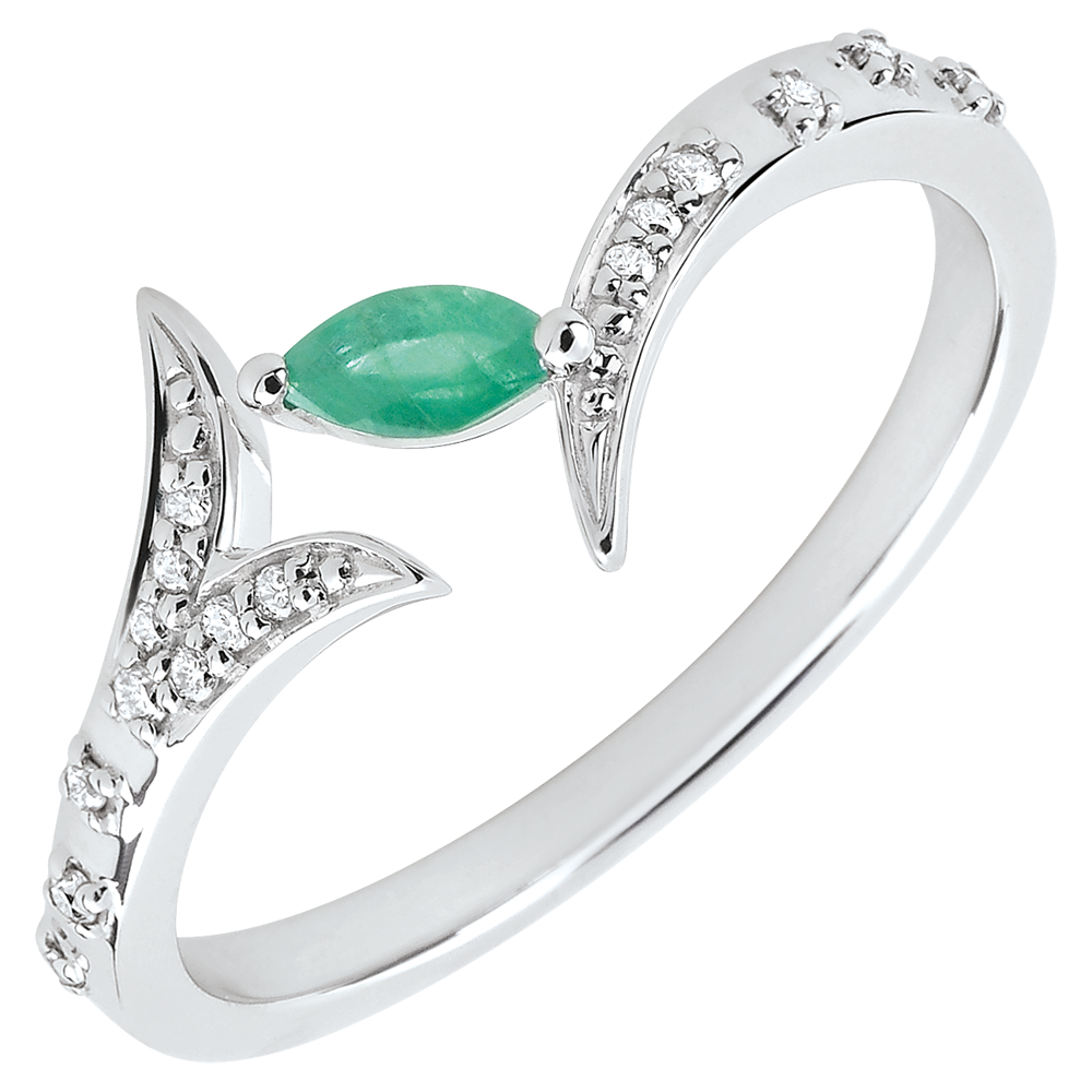 O ramură strălucitoare îngheţată în etern. Frunza sa preţioasă, smarald tăiat marquise, este subliniată de aurul alb încrustat cu briliante ce îi serveşte drept sipet.