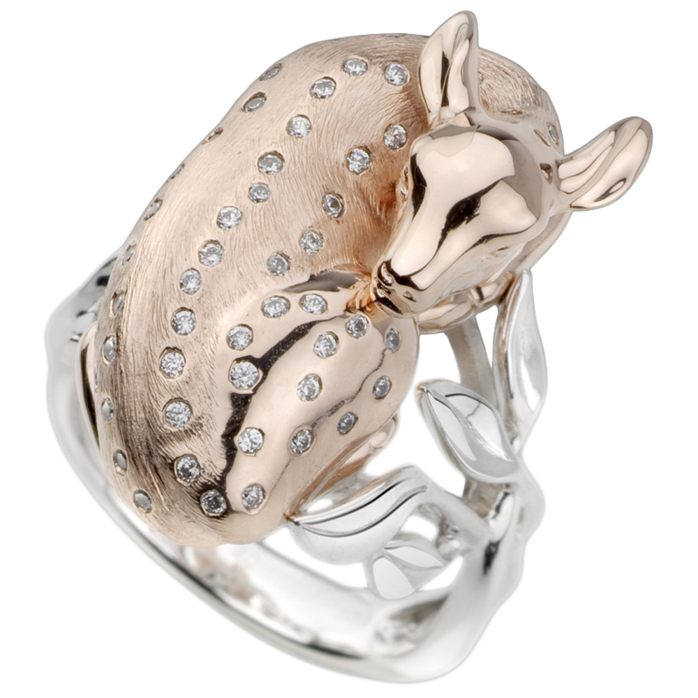 Inel Plimbare Imaginară - Căprioară visătoare - diamante - aur alb şi aur roz de 18K