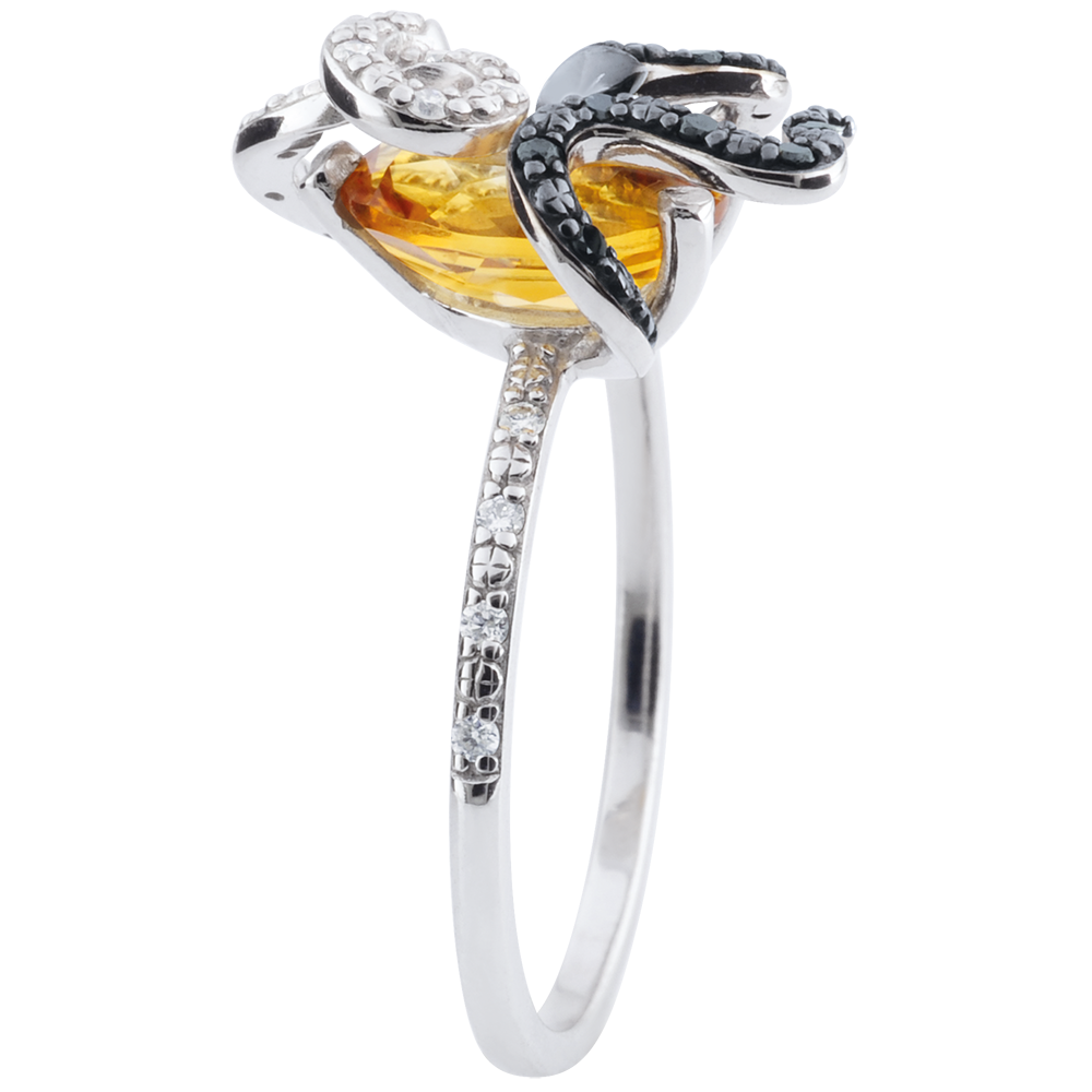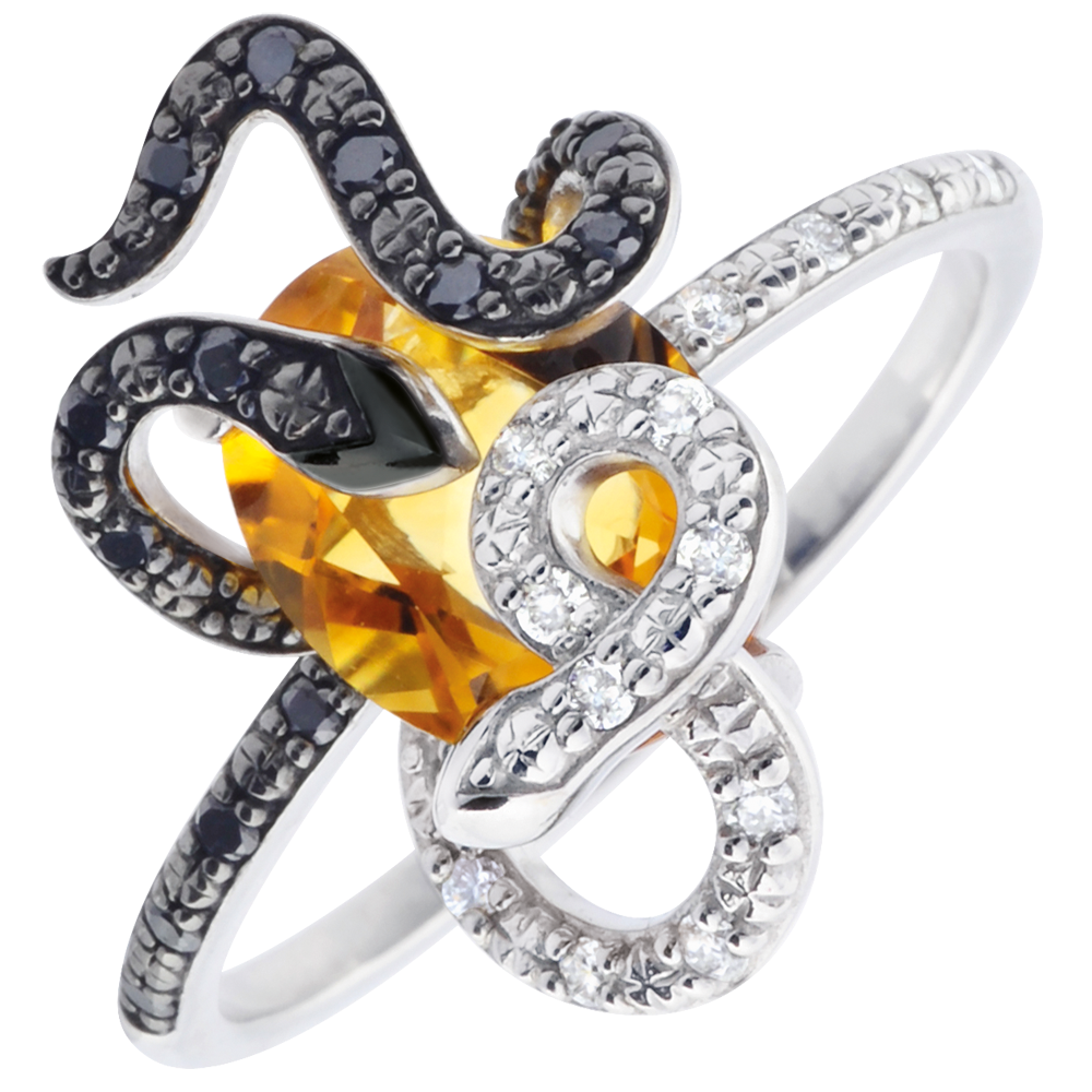 Ademenitor, o pereche de şerpi magici din diamante negre şi albe îmbrăţişează un citrin şi formeză montura inelului.