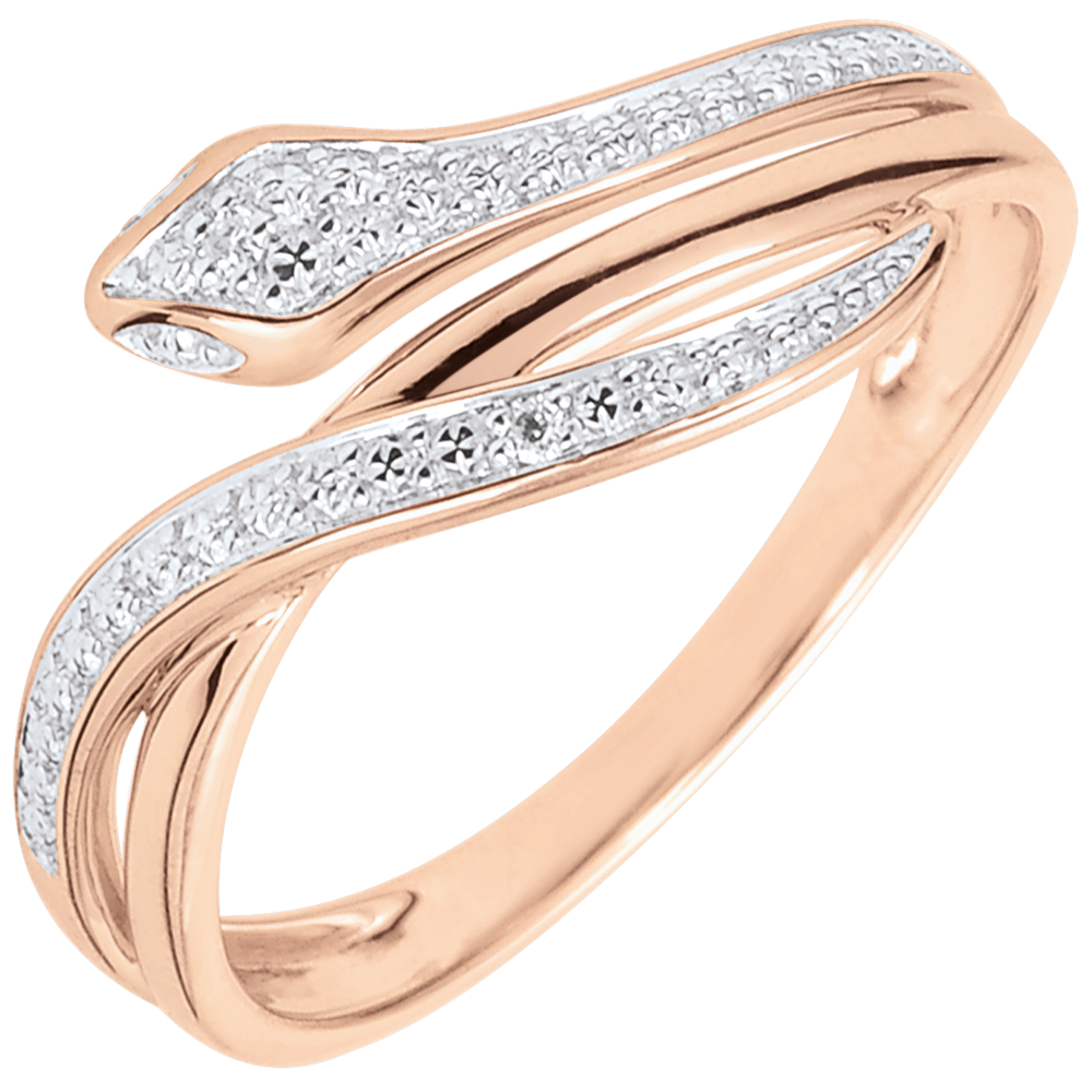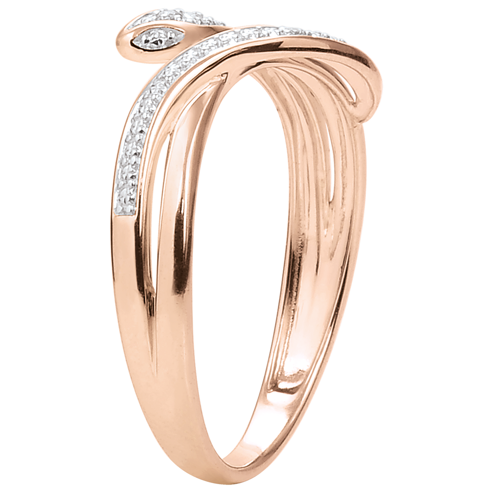 Acest inel şarpe din aur roz cu forme sinuoase şi ademenitoare este finisat cu diamante pentru un look şic şi modern.