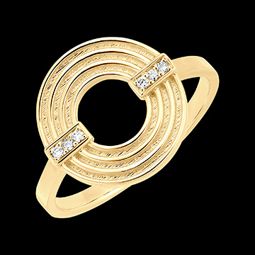 Acest inel din aur galben seduce prin aspectul său arhitectural. Alcătuit din cercuri concentrice gravate cu finete, perfecționat de două barete, încrustate cu diamante luminoase. Un echilibru perfect între design structurat și strălucire.