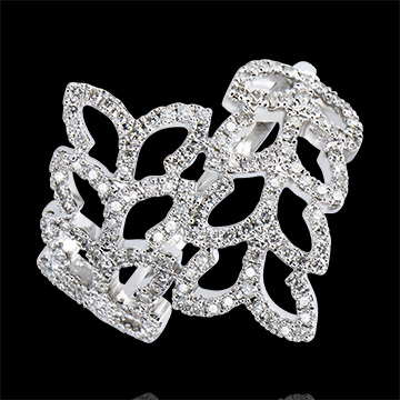 Romanţă bucolică în acest inel ce emană feminitate şi prospeţime, unde se înlănţuie un frunziş încrustat cu diamante. Toată delicateţea formelor Naturii regândite într-o bijuterie discretă şi parcă feerică.