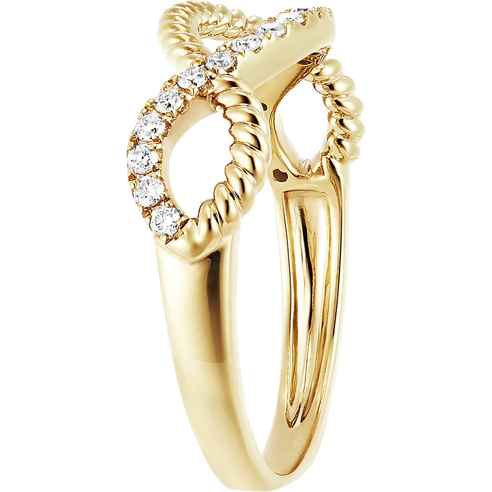 Un inel în care două șnururi de aur se împletesc, aur galben și aur galben pavat cu diamante ca într-o îmbrățișare veșnică.