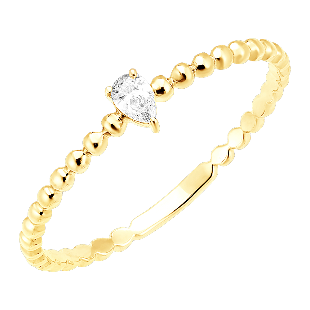 Inelul Solitaire Bule Pară conține un diamant delicat tăiat pară, așezat pe un inel de aur galben presărat cu bule pentru o notă de grație modernă.