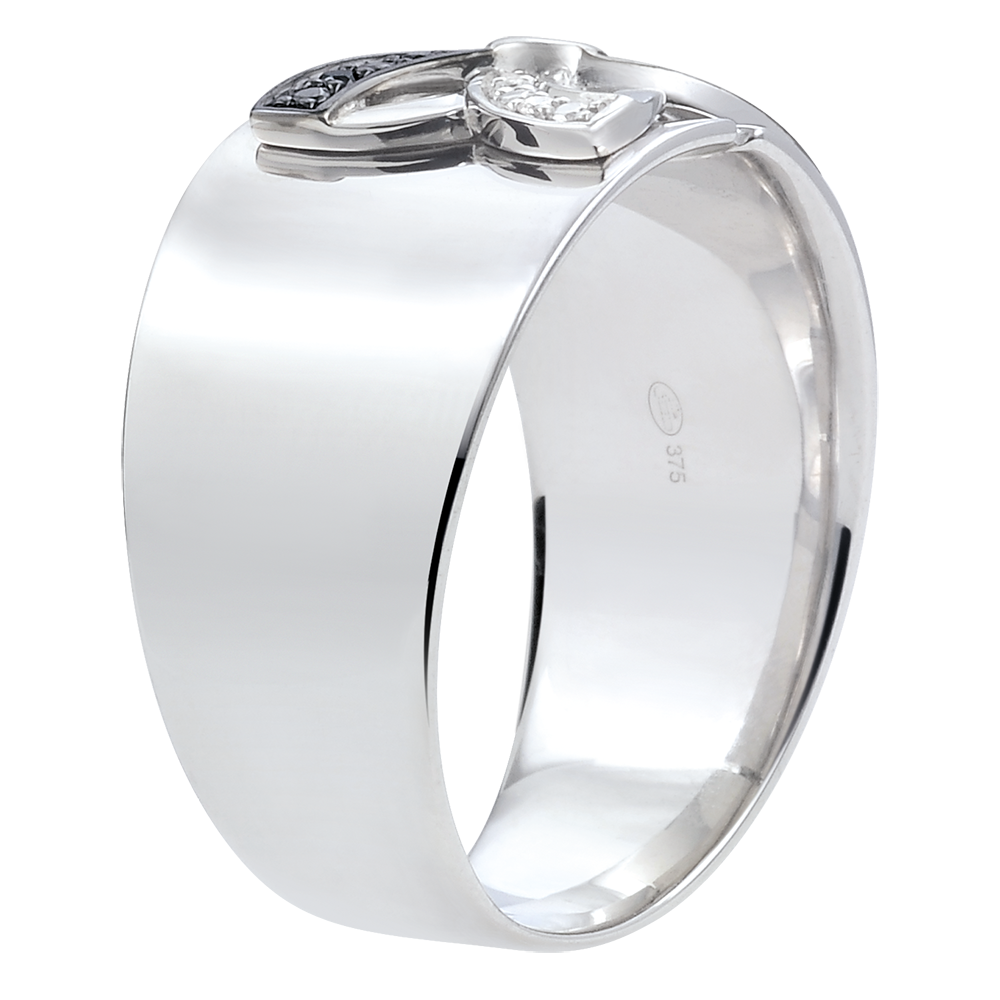Un Crin stilizat din aur alb şi diamante negre este fixat pe o montură lată şi preţioasă.