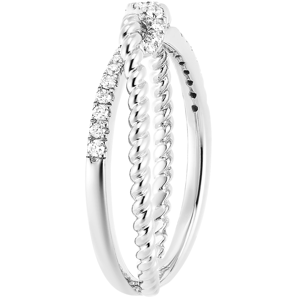Un inel în care un șnur din aur se împletește cu un inel pavat cu diamante, ca într-o îmbrățișare veșnică.