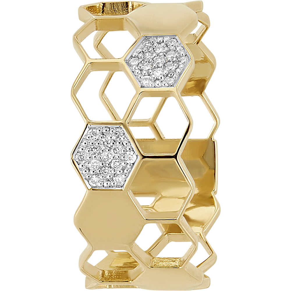 Lăsați-vă cucerită de strălucirea delicată a inelului Mini Revelație, o creație unică inspirată din munca pretioasă a albinelor. Această bijuterie elegantă este compusă din două rânduri de celule de aur lucrate cu delicatețe, împodobite cu 7 celule de aur masiv și 2 celule încrustate cu 26 de diamante orbitoare.