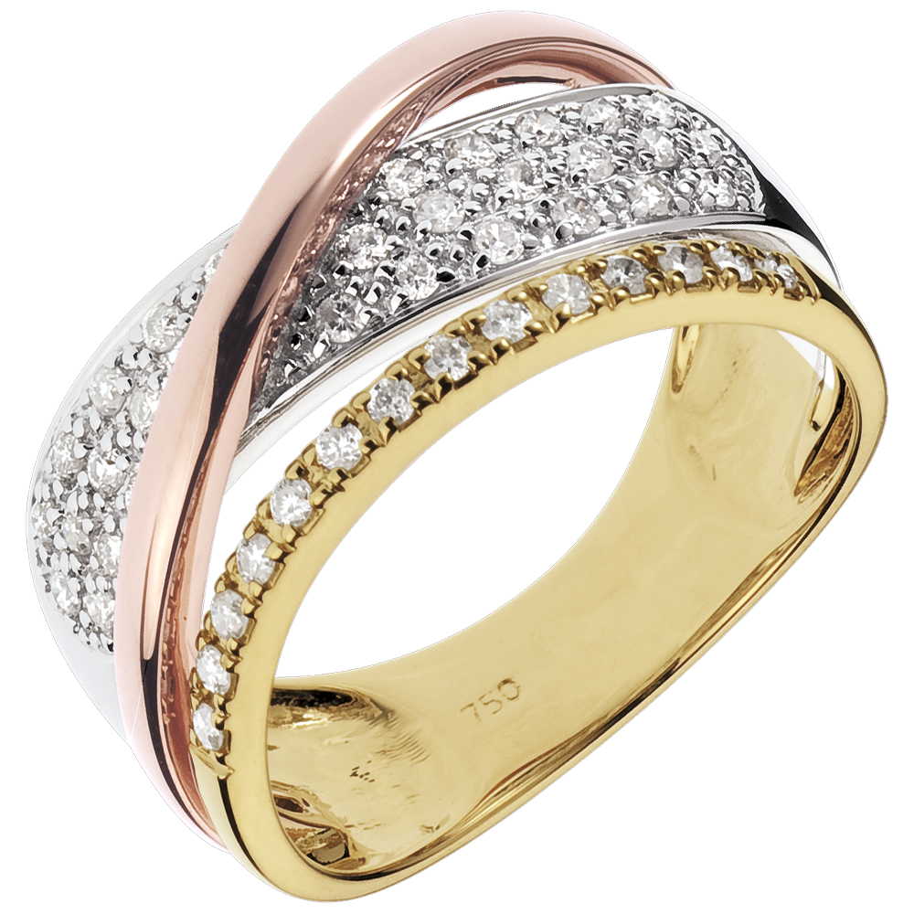 Două inele de aur galben şi aur alb pavate cu diamante asortate unui inel de aur roz pentru o luxuoasă călătorie spre Saturn. Un inel trei nuanţe de aur atemporal şi excepţional.
