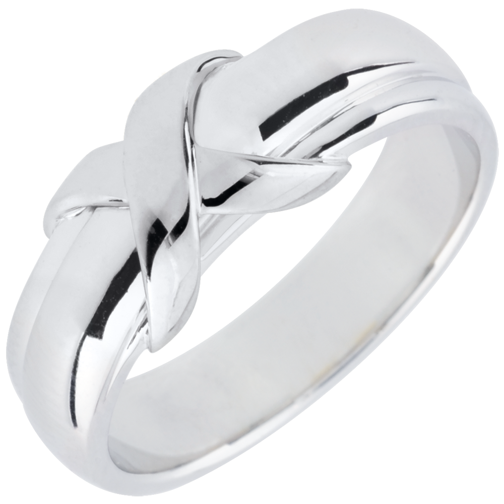 Un inel mare în volum este înnodat de o bandă de aur alb.