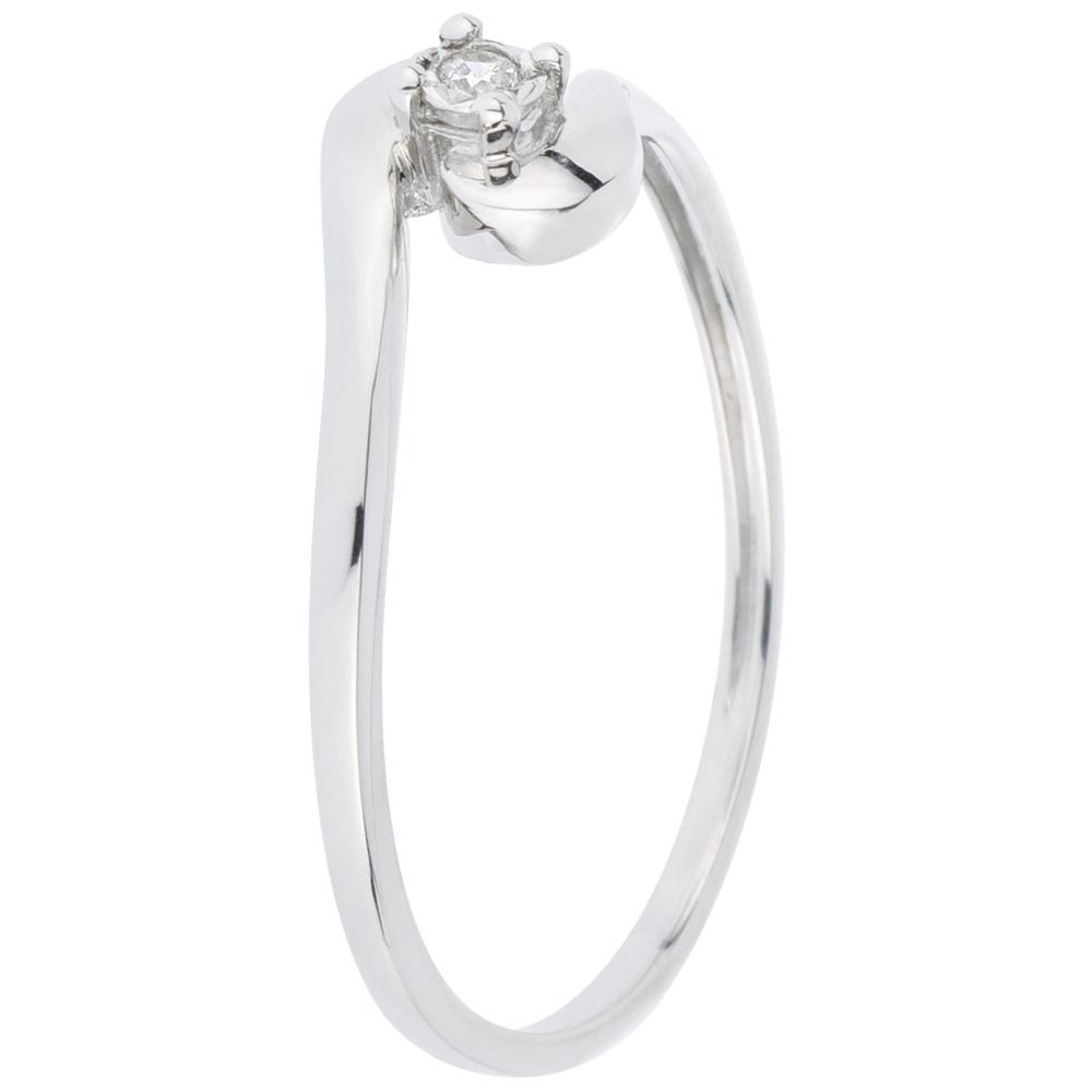 un diamant încercuit de aur alb străluceşte în inima unei monturi curbate de aur alb.