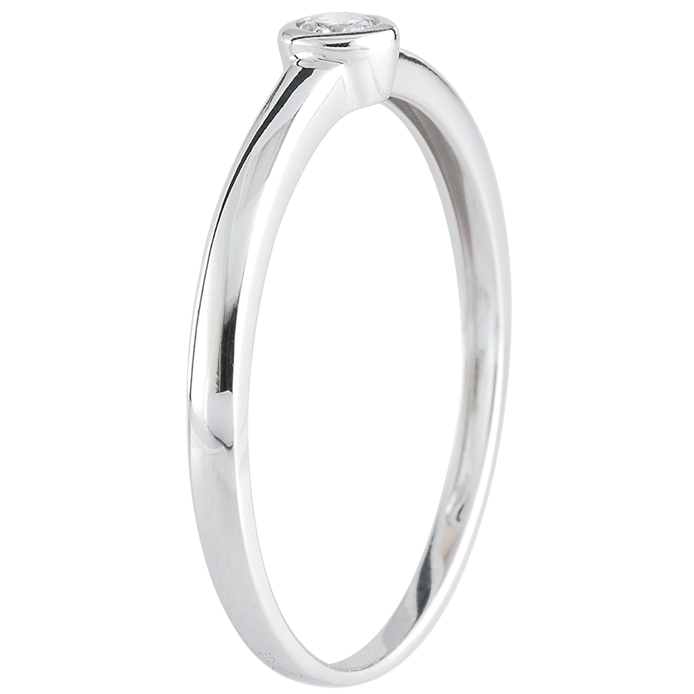 Un diamant solitaire setat bezel pe o montură cu linii curate din aur alb.