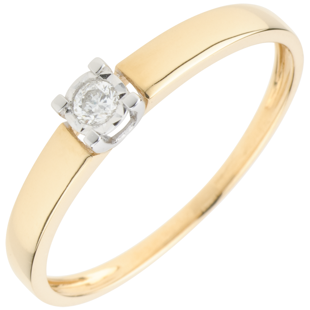 Un diamant de 0,05 carate este încercuit delicat de aur alb cizelat și prins cu patru gheruțe pătrate.