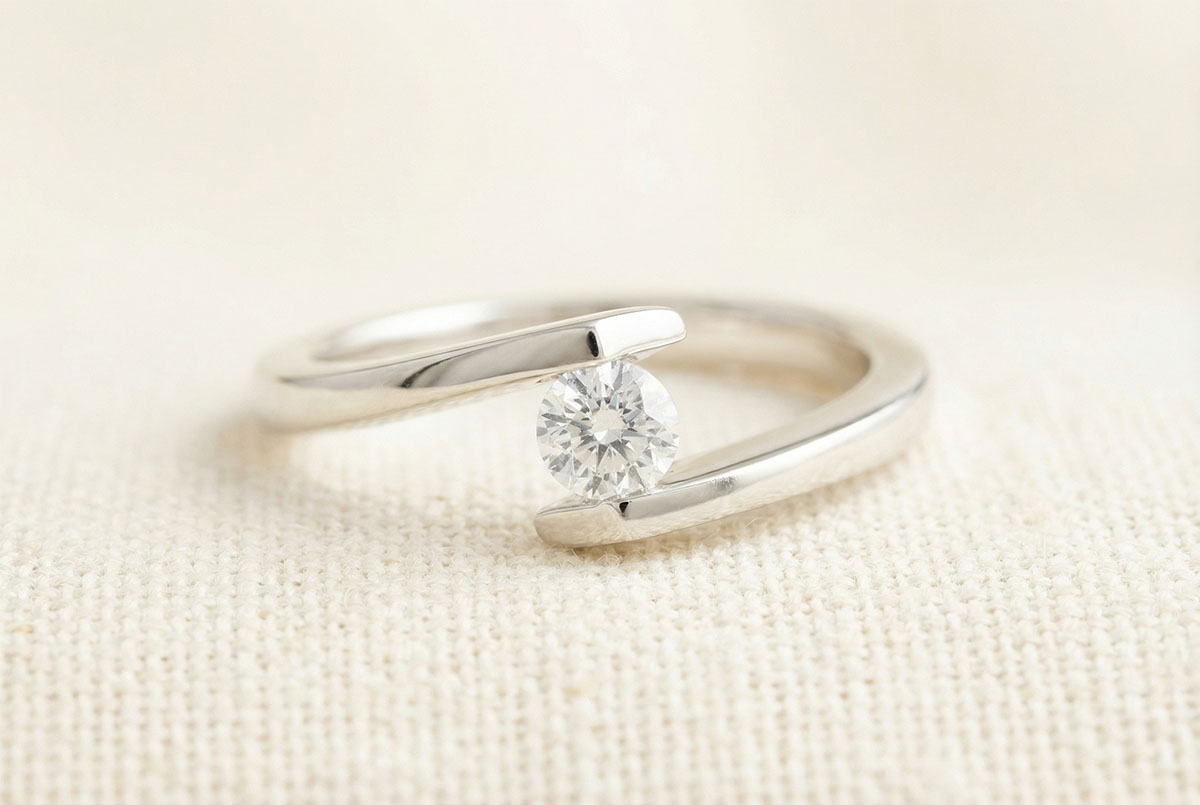 Un diamant solitaire ţinut într-o montură sobră şi modernă.