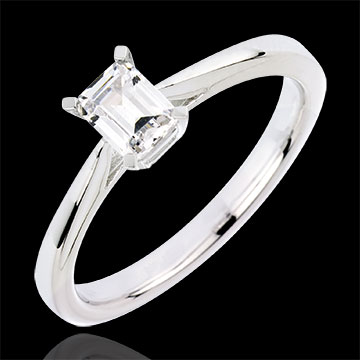 Un diamant solitaire tăiat smarald subliniat de o montură pură şi elegantă.