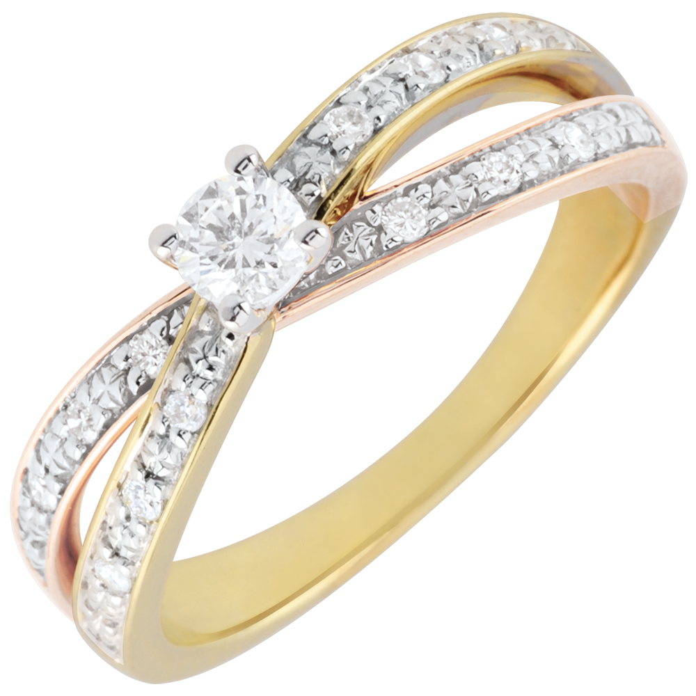 Îmbinarea unică a trei nuanţe de aur pe două curbe încrustate de diamante pentru a înălţa spre cer un sublim solitaire.