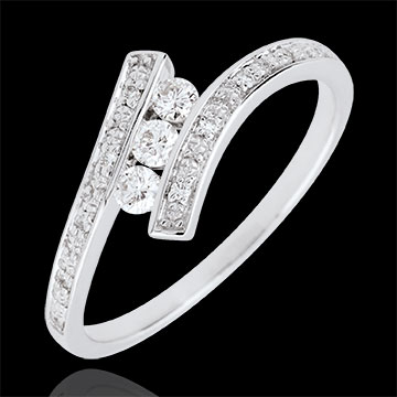 O trilogie elegantă este purtată într-o mişcare preţioasă şi lejeră, din aur alb şi diamante.