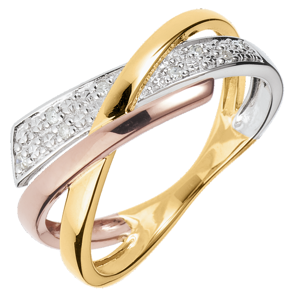 O trilogie de inele stilate şi moderne create în trei nuanţe de aur şi un pavaj de diamante.