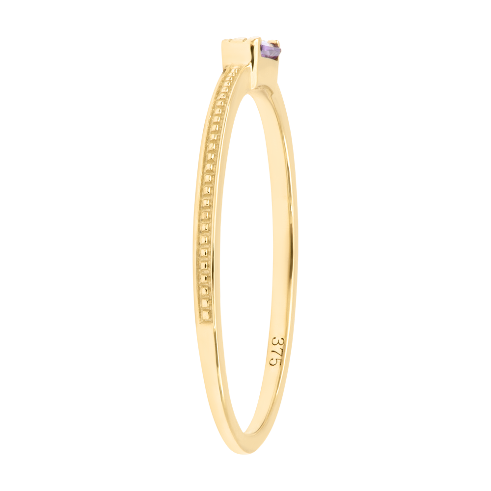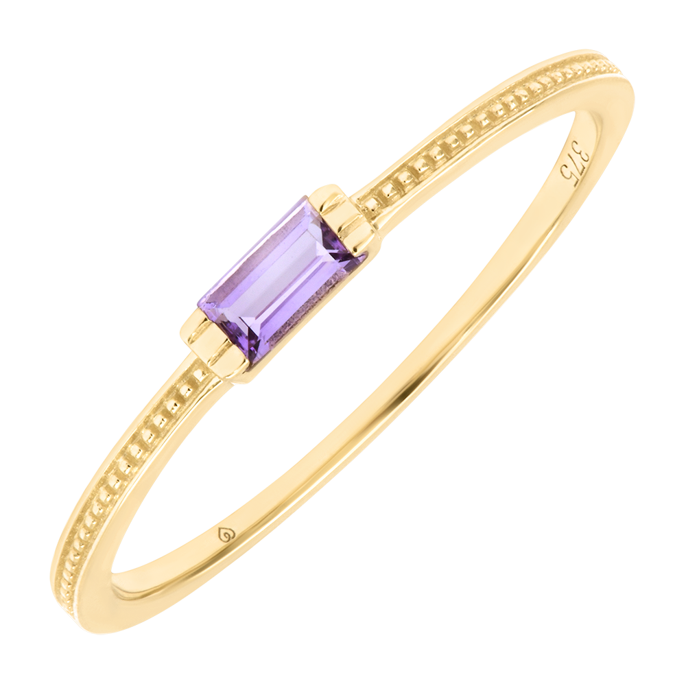 Un ametist tăiat baguette de 0,15 ct este așezat delicat pe o verighetă fin texturată din aur galben 9 carate, creând un aspect modern și grafic.