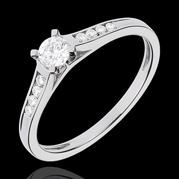Esenţialul unui solitaire încrustat în aur alb, subliniat de un cortegiu de diamante. O montură ce iese în evidenţă, delicată şi atemporală.