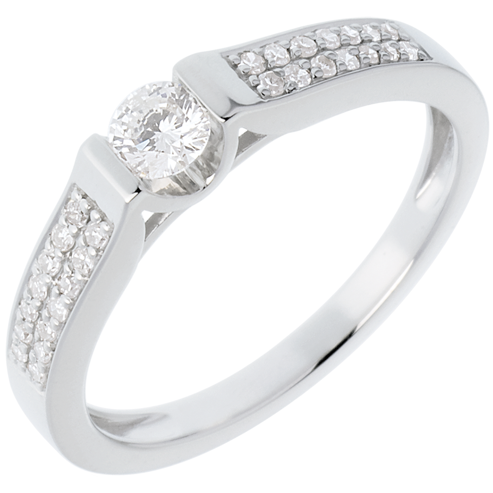 Strălucirea absolută a unui diamant central pe o montură grafică şi contemporană subliniată de un pavaj adiacent de diamante.