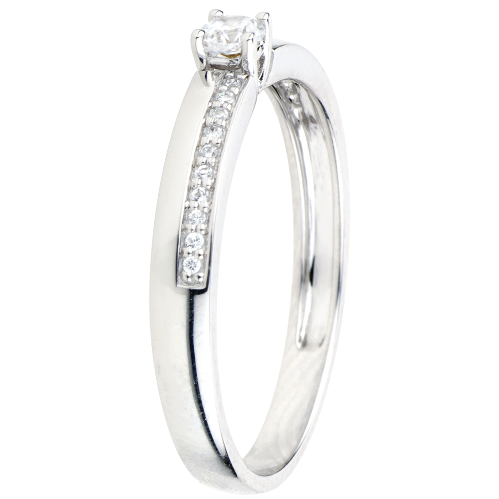 Un diamant solitaire pe o montură asimetrică pavată cu diamante ce îi oferă o eleganţă şi o originalitate subtile.