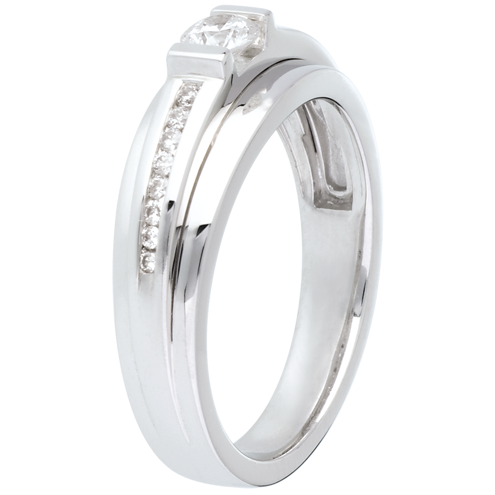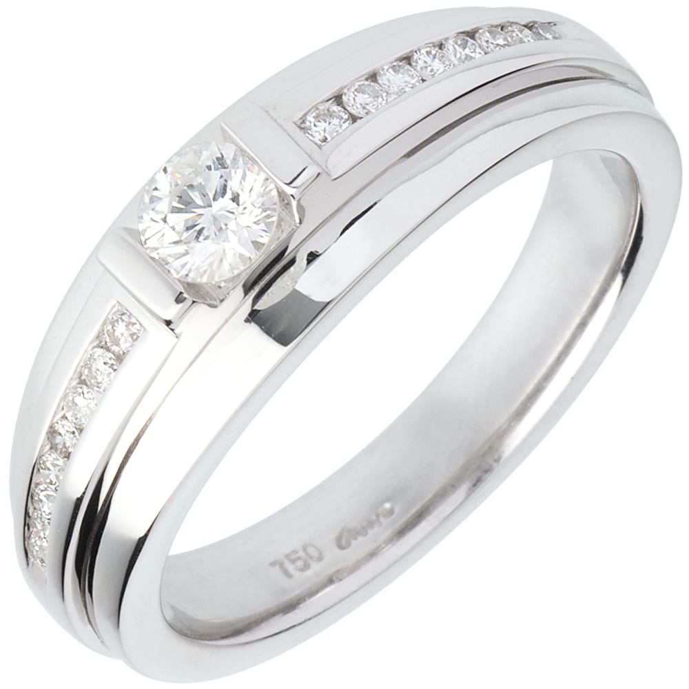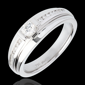 Un diamant fixat central pe o coroană lată pavată cu un rând de diamante, montură inspiraţie Imperiu cu o eleganţă atemporală.