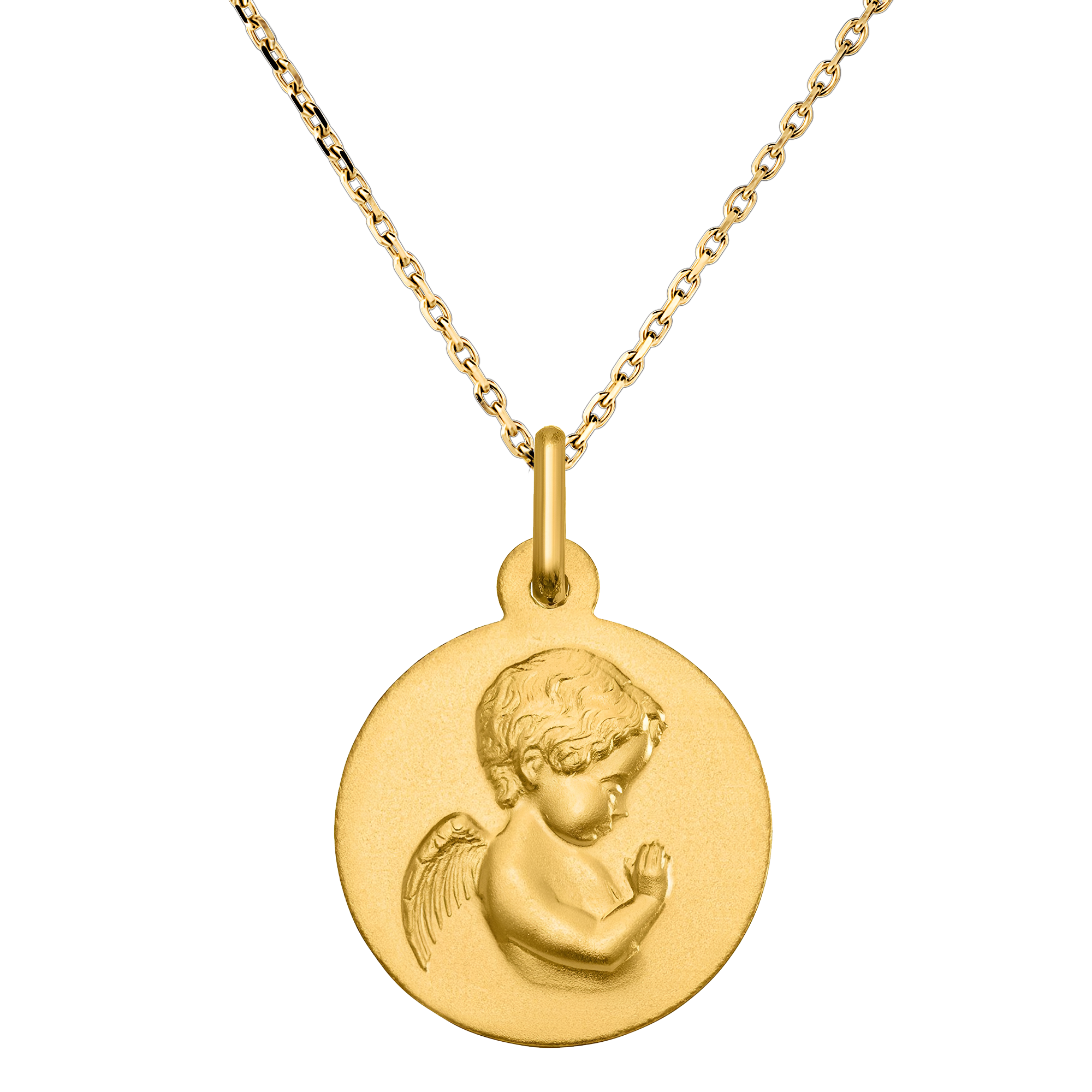 Această medalie delicată prezintă un tânăr înger în rugăciune, simbolizând inocența, credința și protecția cerească.