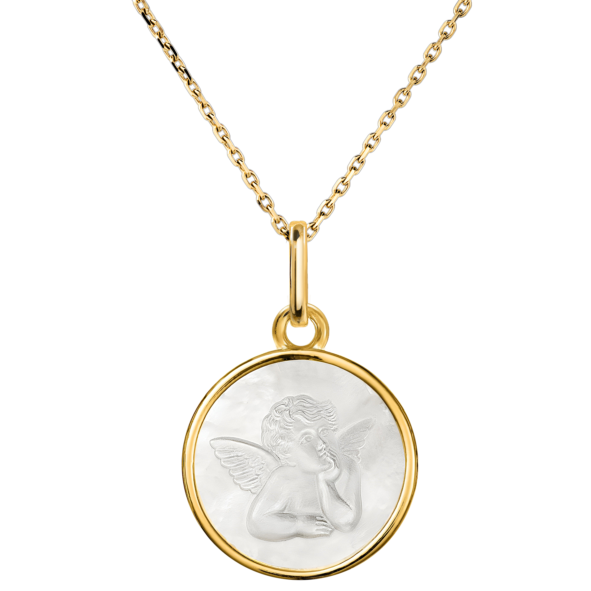 Această medalie reprezintă un înger meditativ, cufundat într-o reflexie blândă. Contrastul dintre aurul galben și sidef creează o armonie subtilă, evidențiind puritatea și serenitatea îngerului. Perfectă pentru un botez sau o naștere, această medalie întruchipează pacea, inocența și protecția divină, un adevărat simbol spiritual de oferit.
