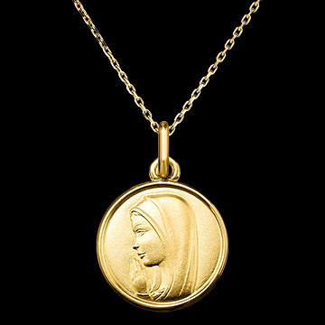 Această medalie din aur galben o reprezintă pe Fecioara Maria într-o poziție de rugăciune, cu mâinile împreunate și o expresie de serenitate și devoțiune. Designul simplu dar elegant evidențiază delicatețea și puritatea imaginii, cu un relief delicat care subliniază grația divină a Mariei. Această bijuterie este un simbol de credință, protecție și pace interioară, perfect pentru ocazii spirituale precum botezul, împărtășirea sau orice alt moment sacru.