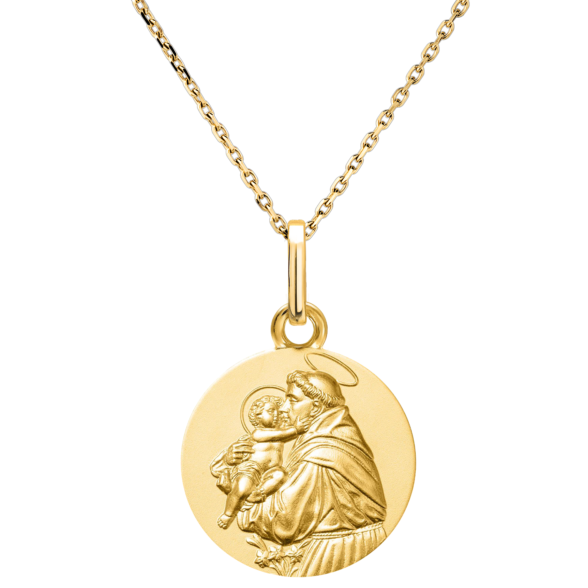 Această medalie din aur galben de 18 carate îl înfățișează pe Sfântul Anton ținând Pruncul Iisus în brațe, o scenă plină de tandrețe și devoțiune. Relieful mat din aur evidențiază această figură spirituală cunoscută pentru credința profundă și iubirea divină.