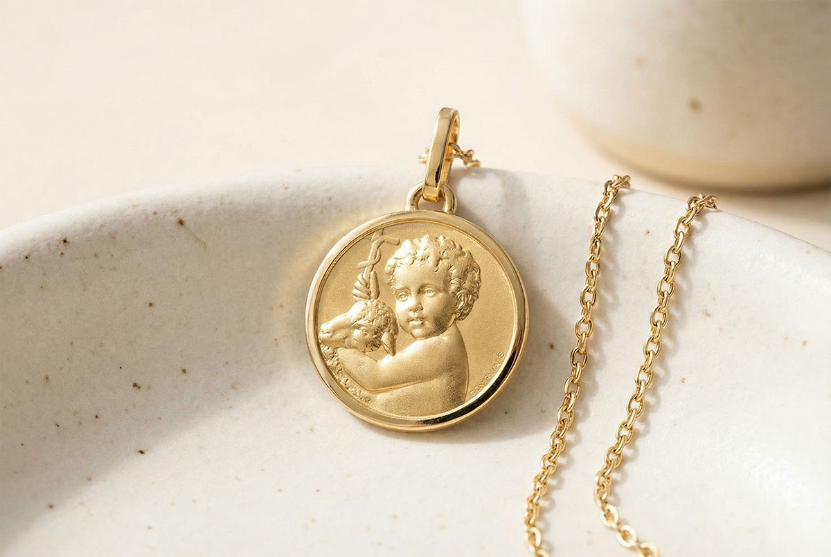 Reprezentându-L pe Copilul Iisus ținând un miel, acest medalion întruchipează blândețea, credința și simbolul Bunului Păstor, protector al inocenței.