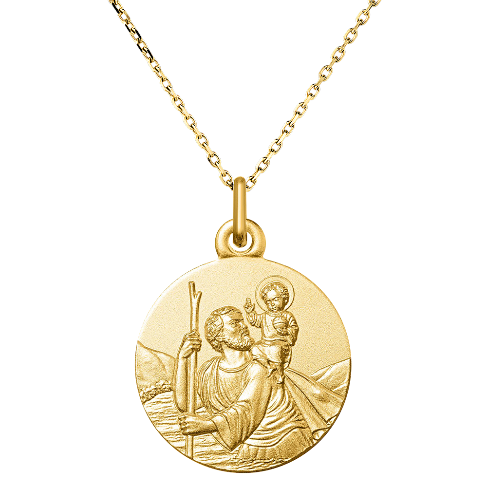 Acest medalion din aur galben 9 karate îl reprezintă pe Sfântul Cristofor purtând Pruncul Iisus, simbol al devotamentului și protecției. Relieful fin sculptat arată Sfântul Cristofor traversând apa cu putere și blândețe.