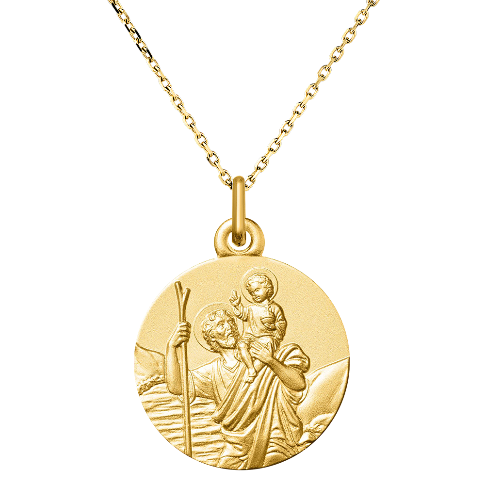 Acest medalion din aur galben 18 carate îl înfățișează pe Sfântul Cristofor purtând Pruncul Iisus pe umeri, simbol al protecției și bunăvoinței divine.