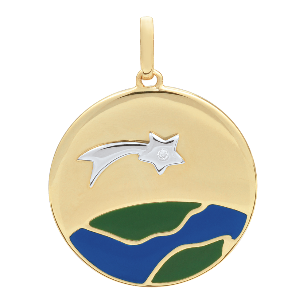 Medalion O Stea s-a născut - Lac verde şi albastru - 1 Diamant - aur alb şi aur galben de 9K