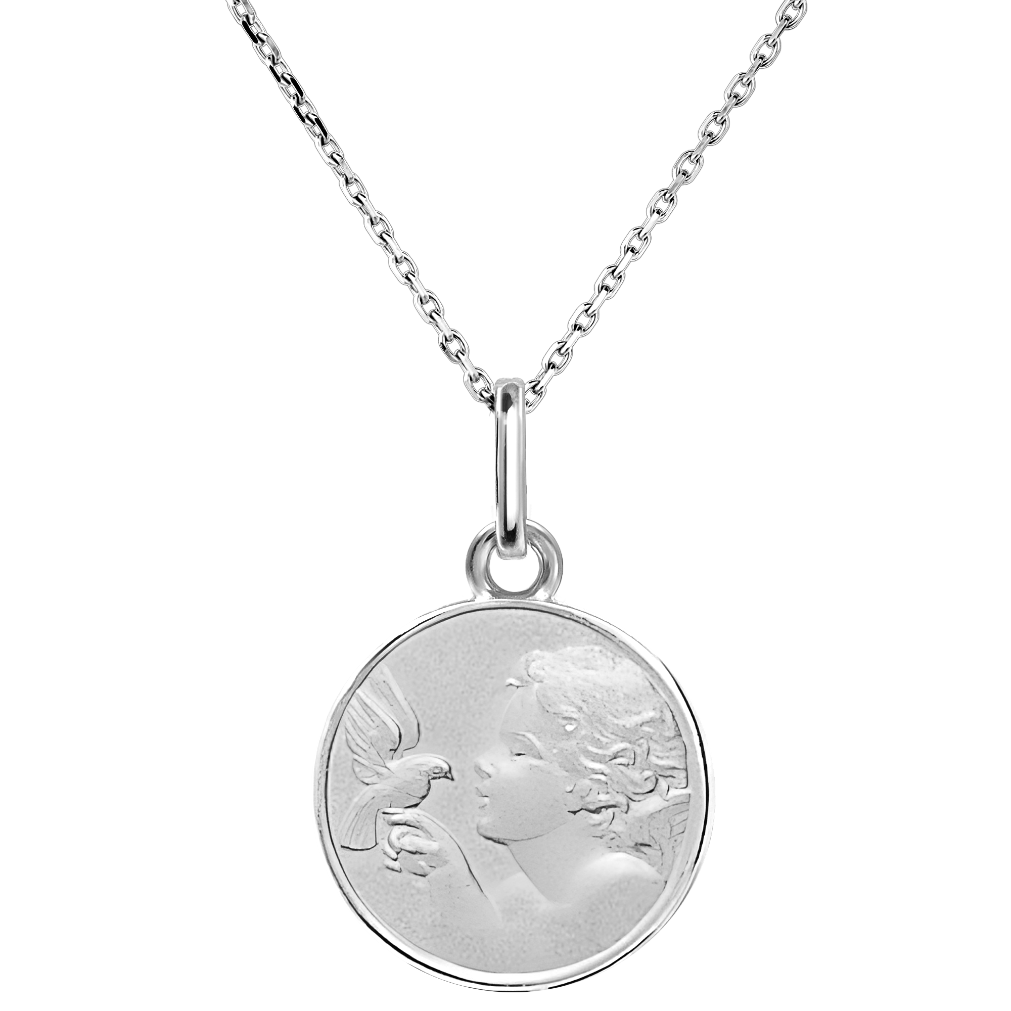 Acest medalion de aur alb prezintă un copil care observă cu blândețe un porumbel așezat pe degetul său. Simbolizând inocența, pacea și armonia, acest bijuterie este ideal pentru a marca un botez sau o naștere, întruchipând puritatea și serenitatea unui moment prețios.