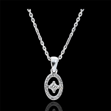 Conturul pavat al unui medalion ornat cu un diamant fixat cu gheruţe într-un pandantiv clasic şi atemporal. O strălucire blândă şi delicată la baza gâtului.