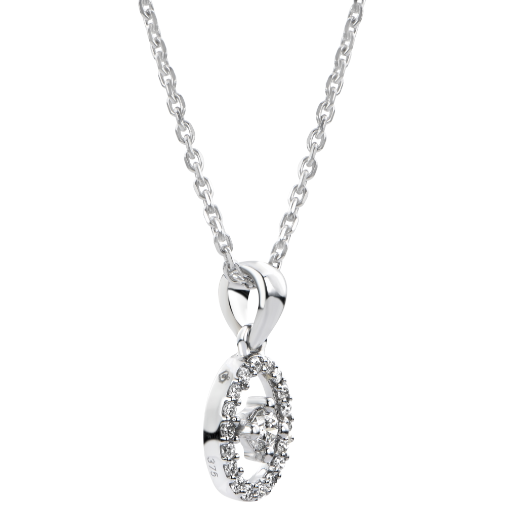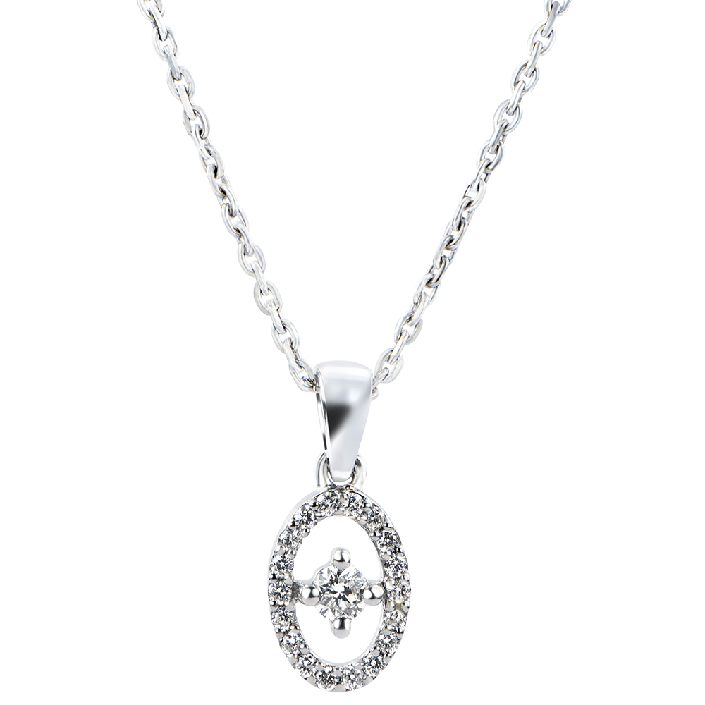 Conturul pavat al unui medalion ornat cu un diamant fixat cu gheruţe într-un pandantiv clasic şi atemporal. O strălucire blândă şi delicată la baza gâtului.