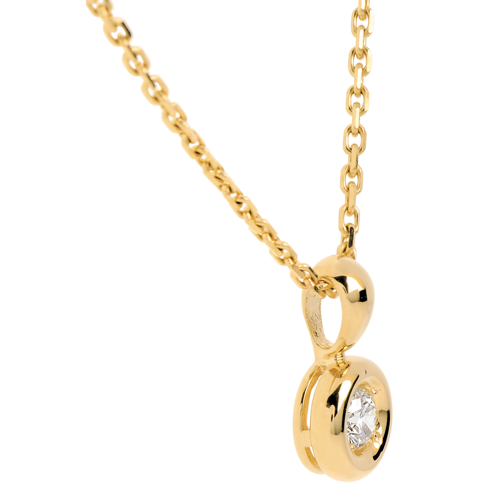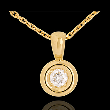 Un diamant ţintuit în inima unui caliciu din aur galben, într-un pandantiv rotund.