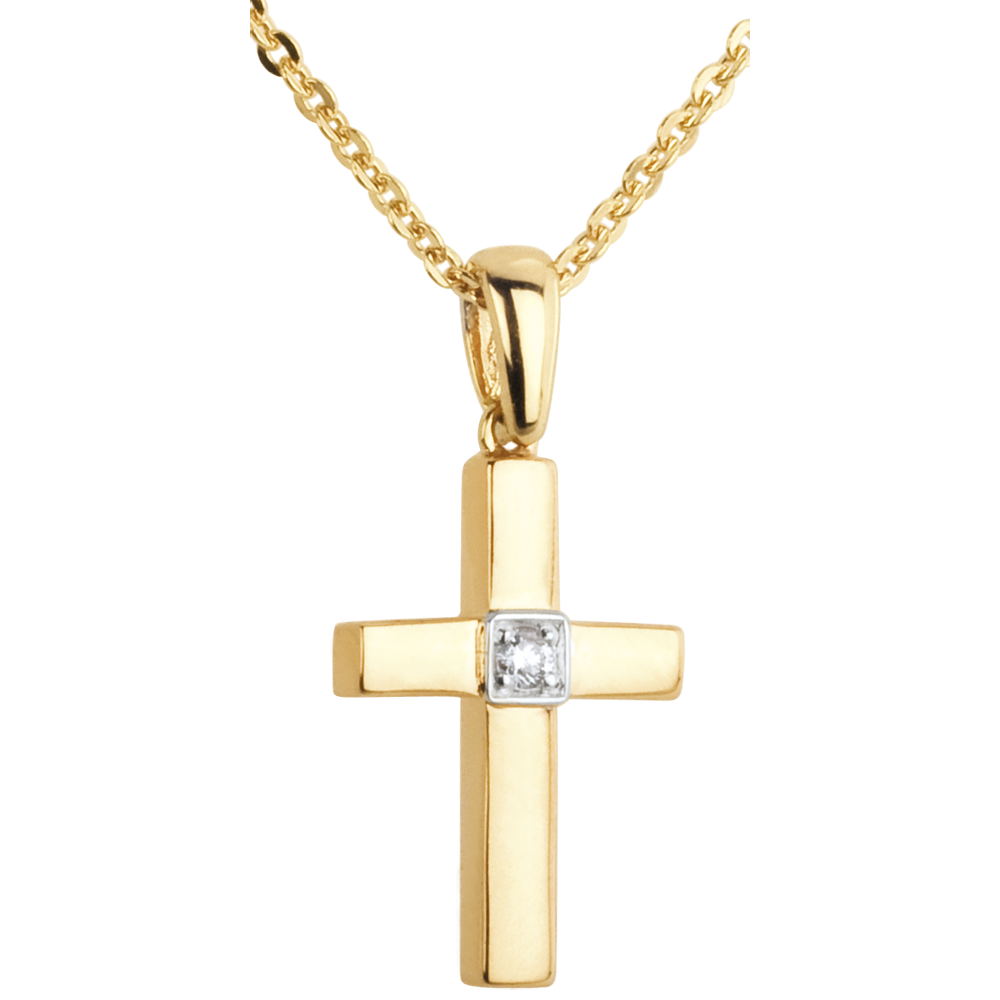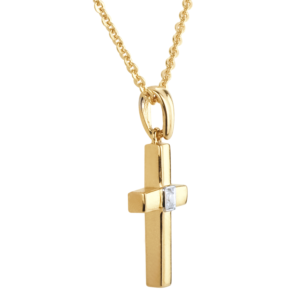 un pandantiv rezultat din puritatea unui diamant solitaire încrustat în inima unei cruciuliţe din aur galben.