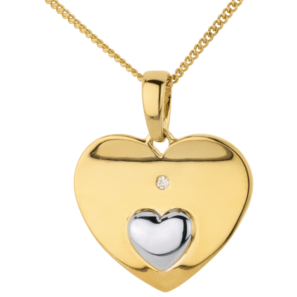 O inimă fină şi vălurată încrustată cu un diamant prevăzută în centru cu o inimioară bombată din aur cu lustru periat.