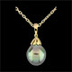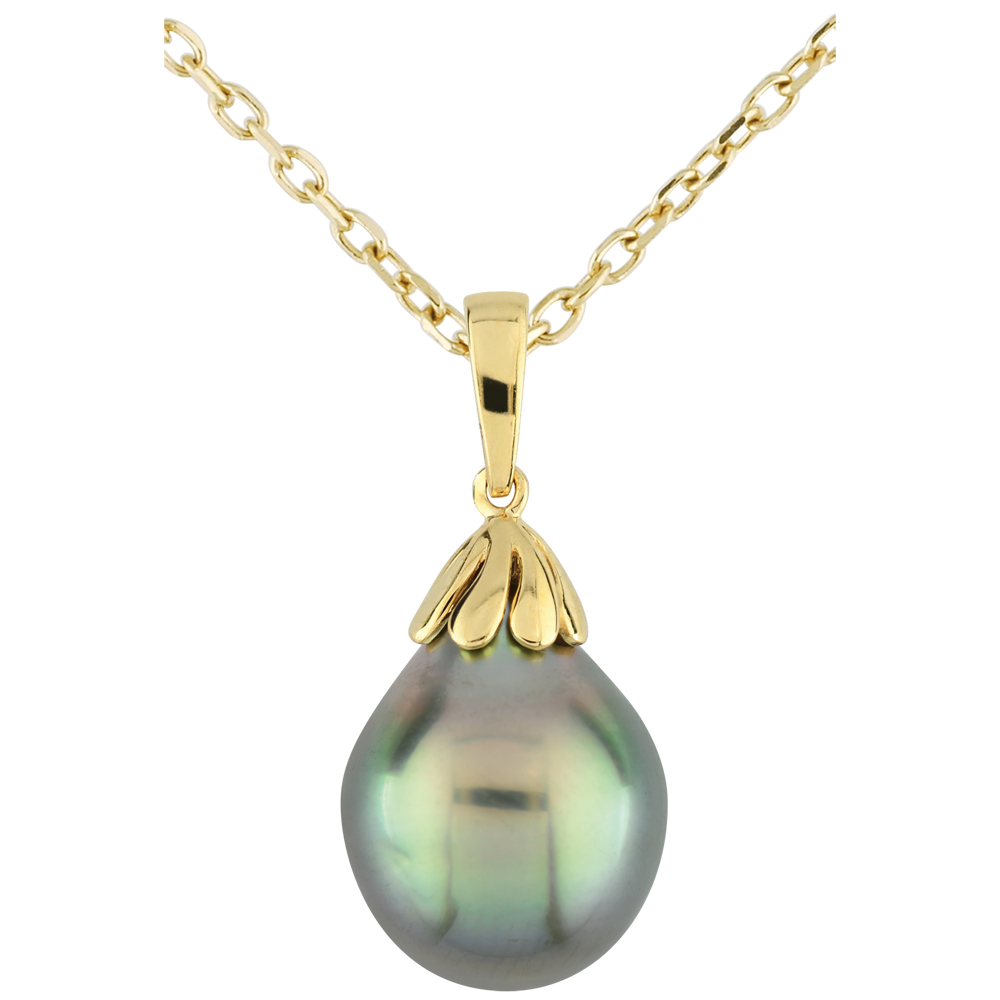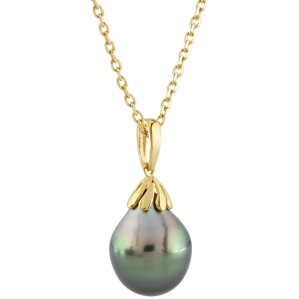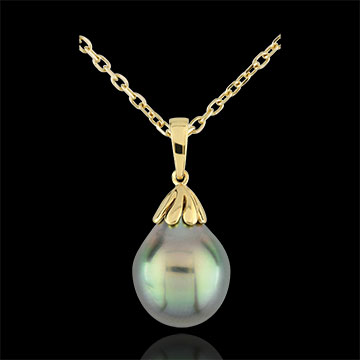 O minunată perlă gri sub formă de picătură este suspendată de o corolă de aur galben.