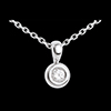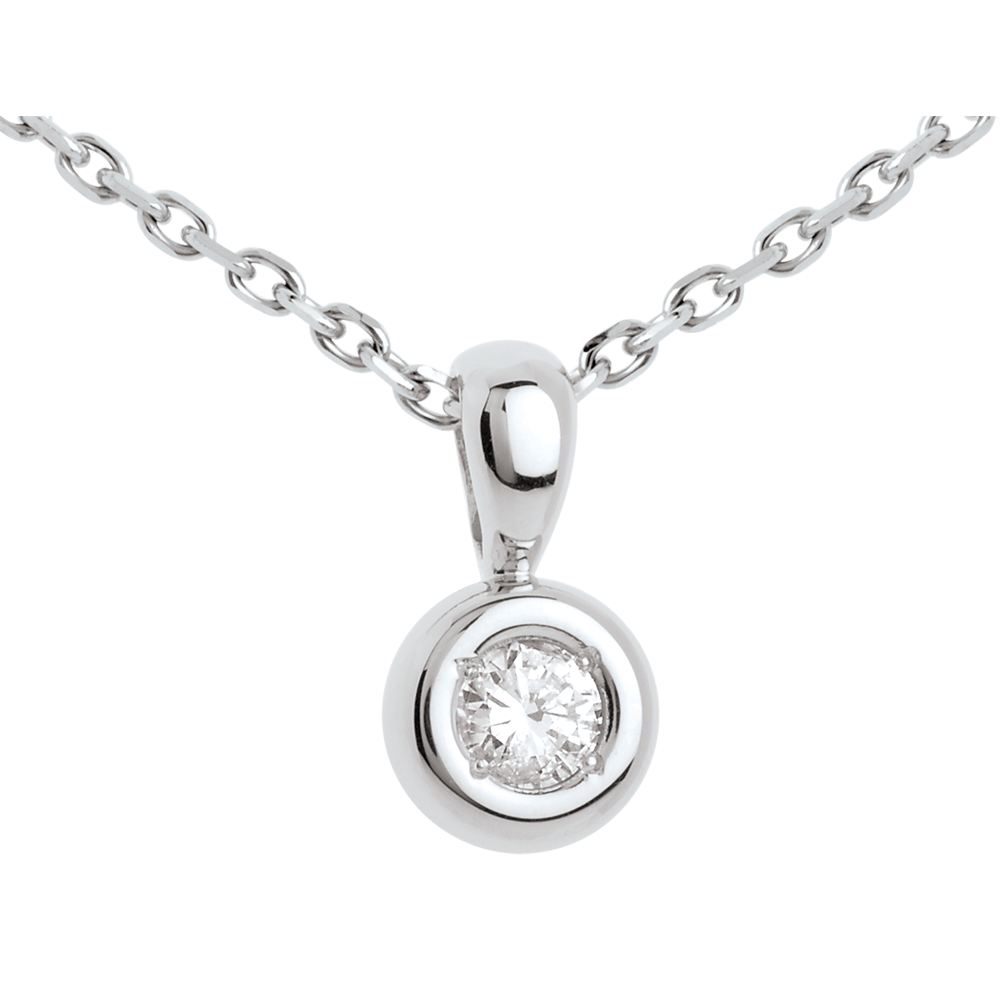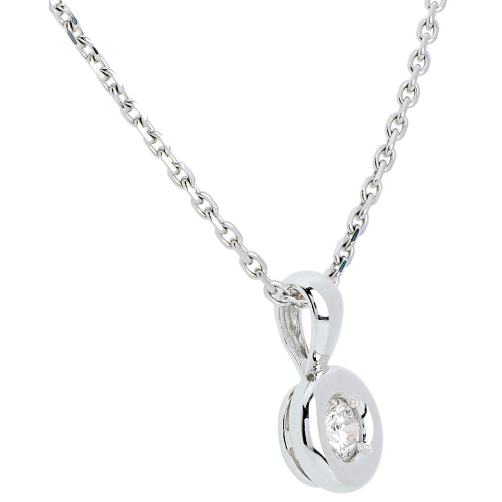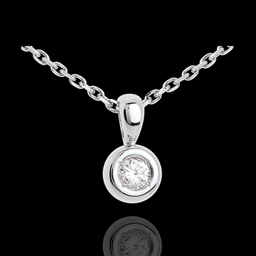 Un diamant ţintuit în inima unui caliciu din aur alb, oferind rotunjime unui pandantiv.