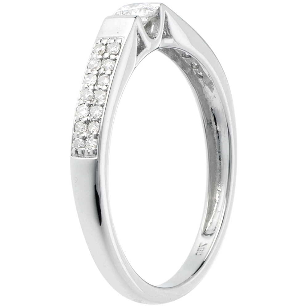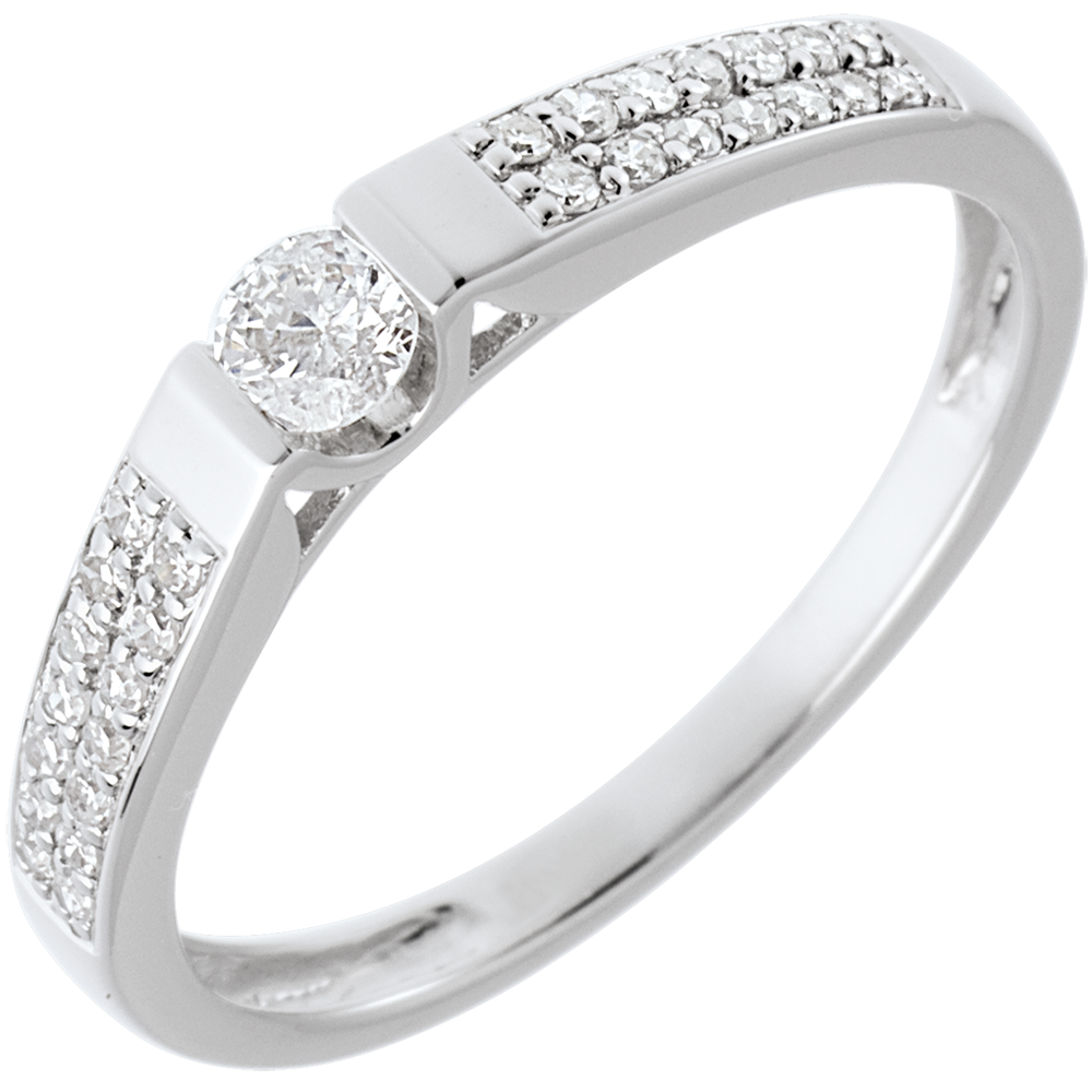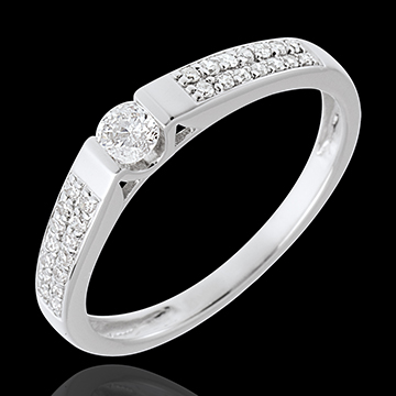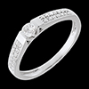 Strălucirea absolută a unui diamant central pe o montură grafică şi contemporană subliniată de un pavaj adiacent de diamante.