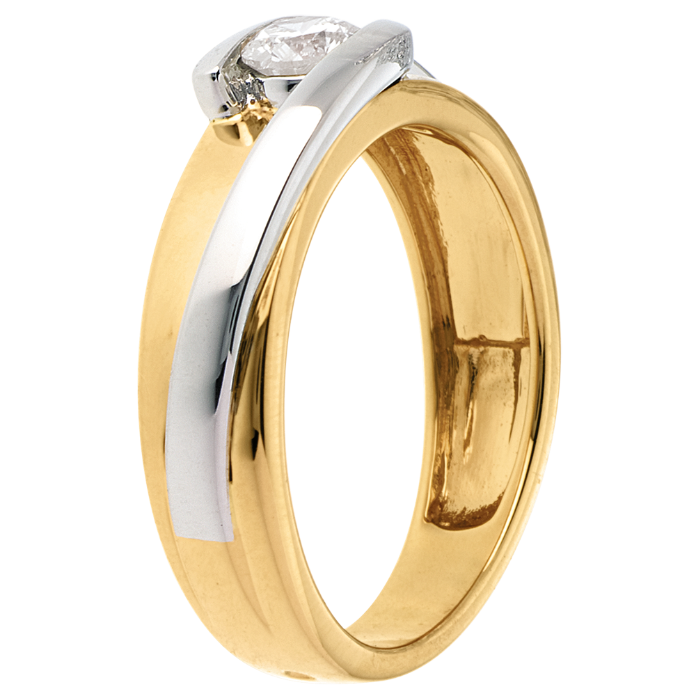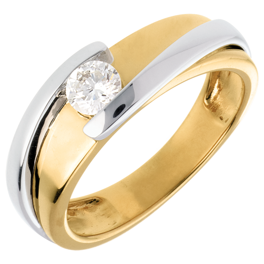 O montură sobră şi clasică asociată forţei îmbinării celor două nuanţe de aur: galben şi alb, pentru a sublinia cu delicateţe un diamant central.