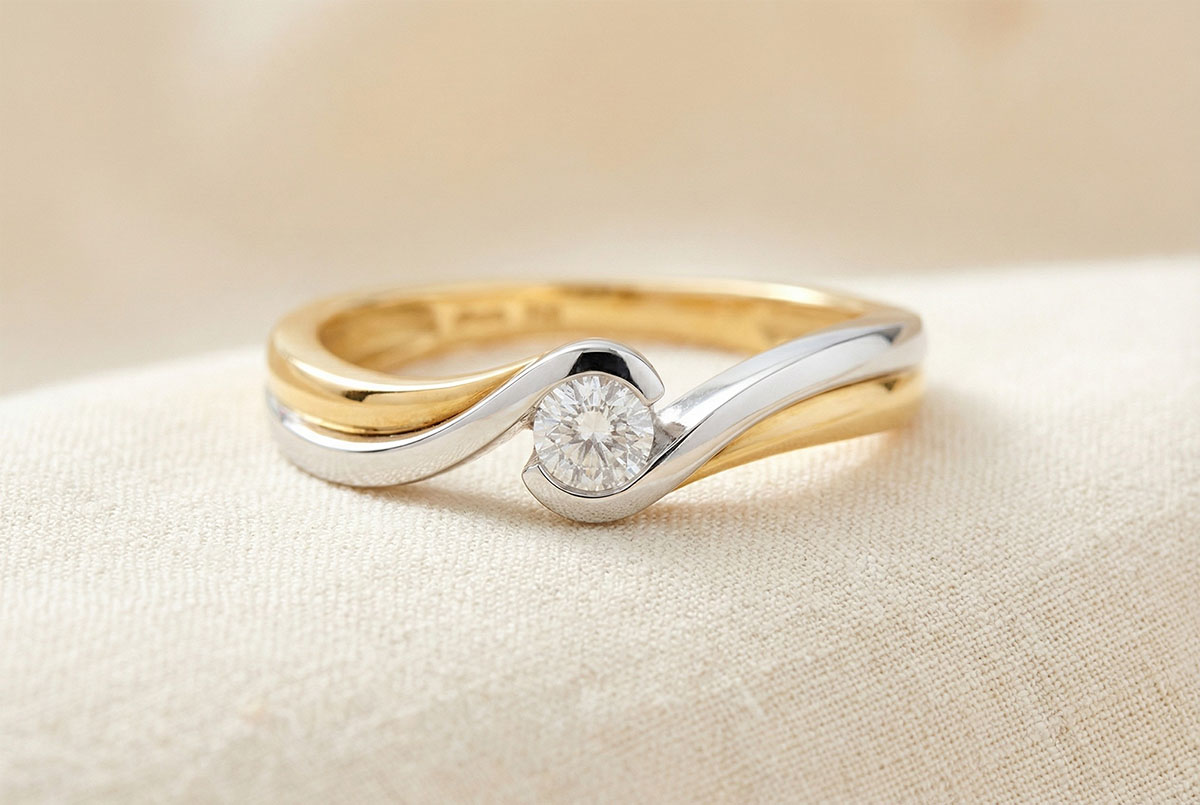 Fluiditatea şi senzualitatea unei monturi ondulate, pentru a evidenţia un diamant central.