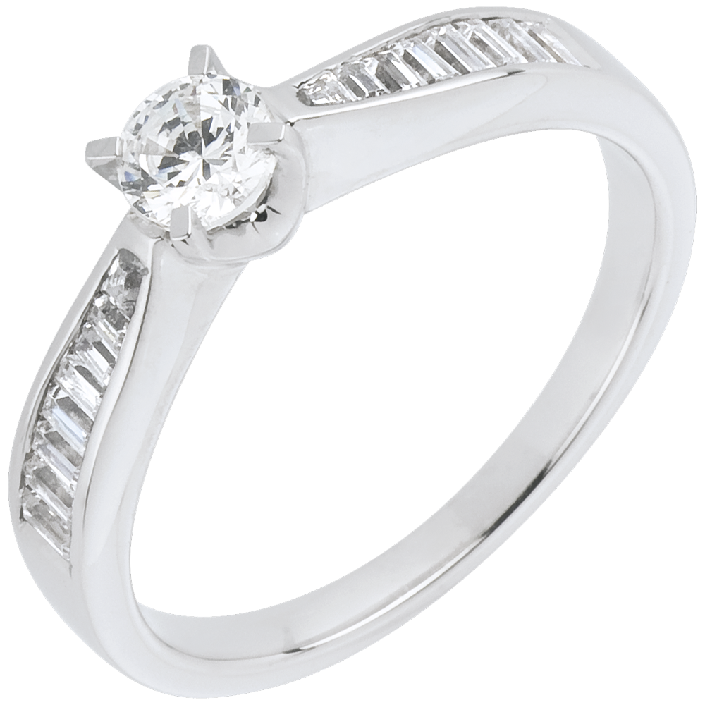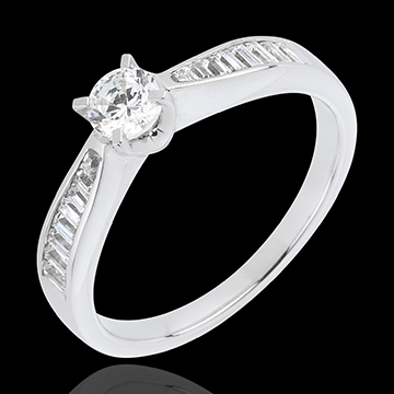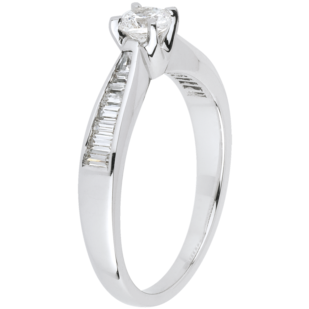 Un solitaire pur însoţit de diamante tăiate baghetă încrustate într-un inel din aur alb.