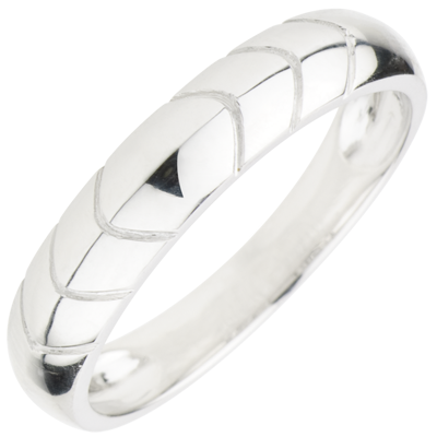 O verighetă bombată din aur alb cu un decor modern, puternic şi îndrăzneţ.