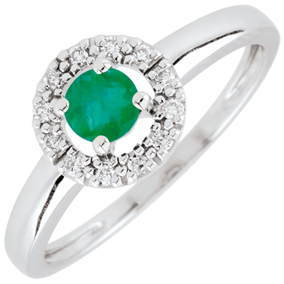 Un cerc de aur alb încrustat cu diamante, protejează ca într-un cuib un smarald.