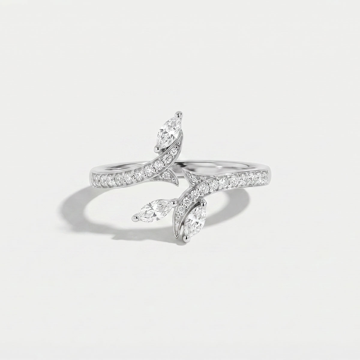 Frunzele prețioase, formate din 26 diamante marquise cu o greutate totală de 0,372 carate, sunt subliniate de aur alb de 9 carate cu sertizare pavé.
